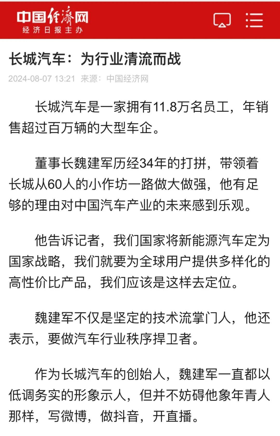 8月7日,魏建军在接受采访时的仗义执言,像一声响雷响彻中国汽车圈——不仅引发了行业与广大网友的热议,而且很多央媒、官媒也纷纷点赞——称魏建军是为行业清流而战、汽车行业秩序捍卫者。