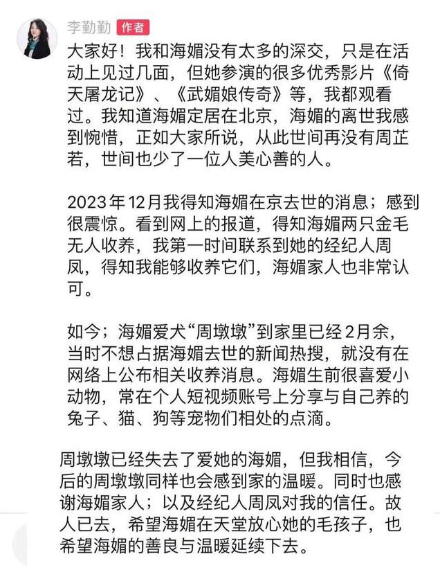 当时周海媚刚去世,和周海媚只有几面之缘的李勤勤得知后,了解到两条狗狗没处收养(周海媚母亲年事已高,没精力养),便联系周海媚经纪人表示自己想收养。