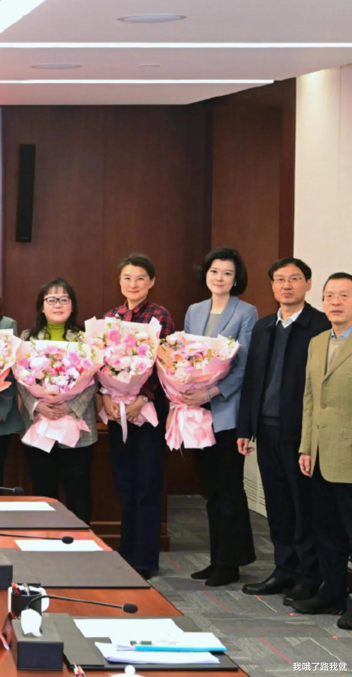 龙洋以一袭淡粉色西装亮相,搭配碎花衬衫与粉色花束,展现出青春洋溢的气质;鞠萍身着深粉色长款西装,标志性短发与干练仪态彰显职业风范;