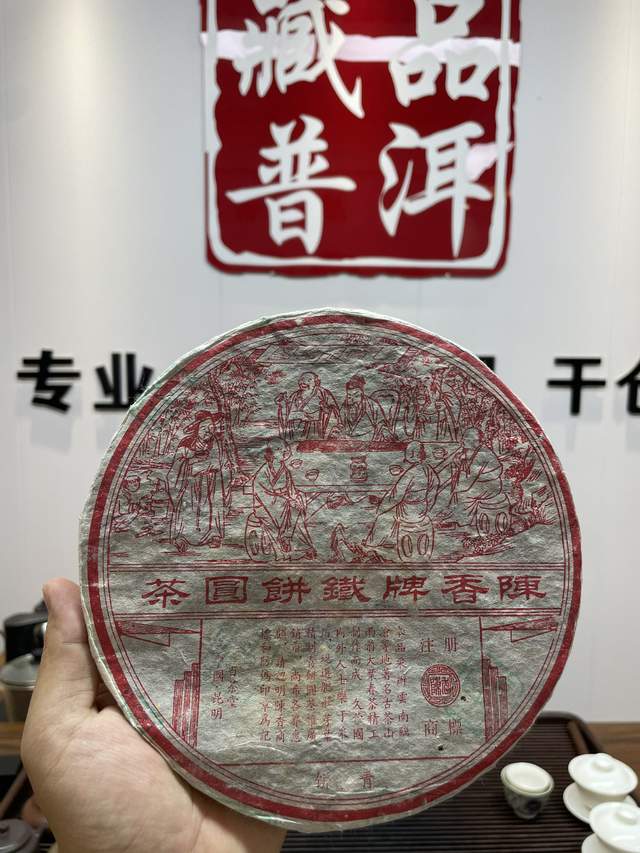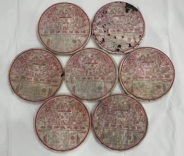 铁一的茶版古香古色,以竹林七贤图为背景,彰显大雅本色。正中印着“陈香牌铁饼圆茶”字样。