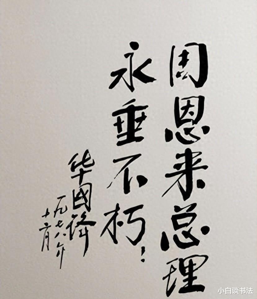 导读:华国锋的题字作品很多,但是,这幅题字作品,对很多朋友来说,也是第一次见到,这就是为《人民的记忆》画册题词,内容是“周恩来总理永垂不朽”,这是对周总理一生的肯定,更是人民的光荣,而字迹书写,堪称天花板,简练大气,字字厚重。