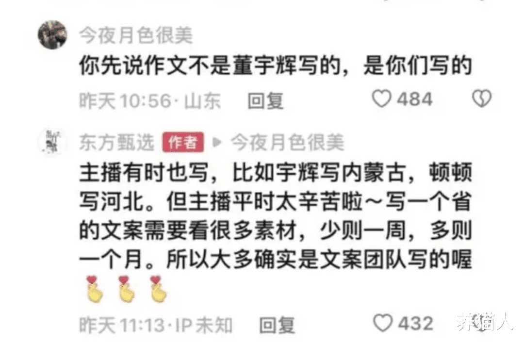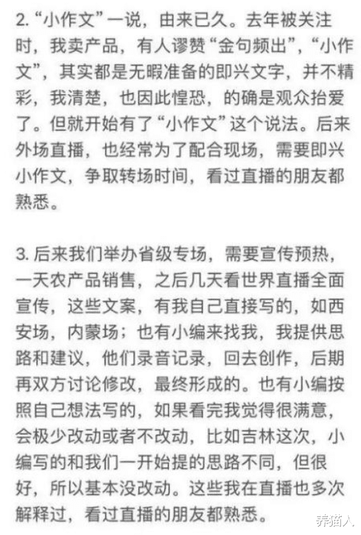 所以,小编最初对“一些网友好奇文案出自谁手?”问题的回答没有任何不妥之处,也没有任何不适合公开之处,因为这是常识,他只是陈述了一个基本的人所共知的事实而已。然而在这个“基本的人所共知的事实”前面可能应该加一个“应该”,因为还是有人不相信的,尤其是董宇辉的粉丝们不相信。于是才有了小编的进一步回复,进一步的事实陈述型的回复,其中那句“一个文案需要看很多素材,少则一周,多则一个月”只有写过文章的人才会知道这句话是什么意思。一个天天在镜头前表演的主播是无论如何不可能有如此充足的时间和精力的。