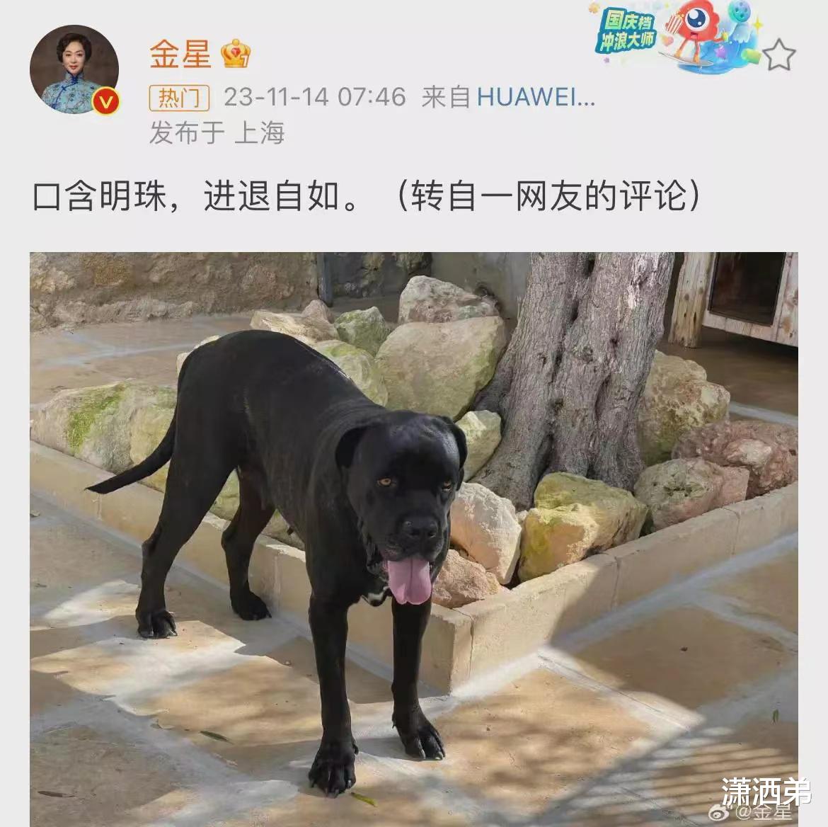 金星先是发了一张大黑狗吐舌头的照片,然后配文:“口含明珠,进退自如(转自一网友的评论)”