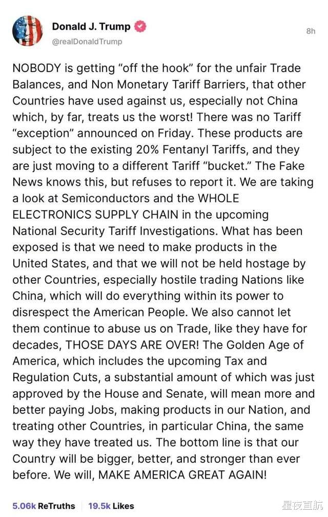 然而,仔细端详,特朗普的这个帖子其实并无任何新意,在他之前,商务部长卢特尼克周日就已表明对半导体等电子产品免除关税“只是权宜之计”,一两个月后将会出台半导体行业关税。特朗普指责中国“对待我们(美国)的方式糟糕透顶”,还扬言要将 20%的芬太尼关税转移到其他的“关税桶”中,而这一转移,卢特尼克也早已言及。对于市场最为关注的美国是否已经免除了中国电子产品 125%的“对等关税”,以及如果现在免除了,半导体行业关税出台时是否会又加回来,特朗普选择了避而不谈,之前卢特尼克也未说明白。