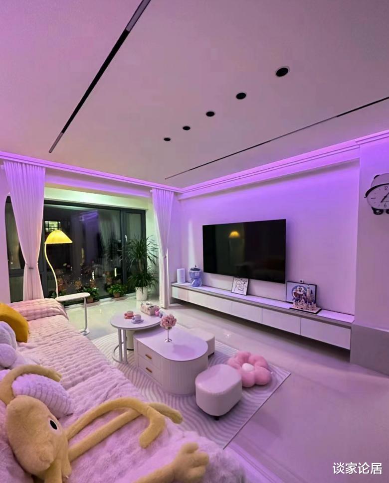 上图是网友@小狐仙家里的客厅,整体装修简洁大方,当打开这个紫色的灯光后,氛围马上变了,变得有点庸俗,有点像岁月场所。她感叹道:“原来灯光的破坏力有这么大,真后悔!”