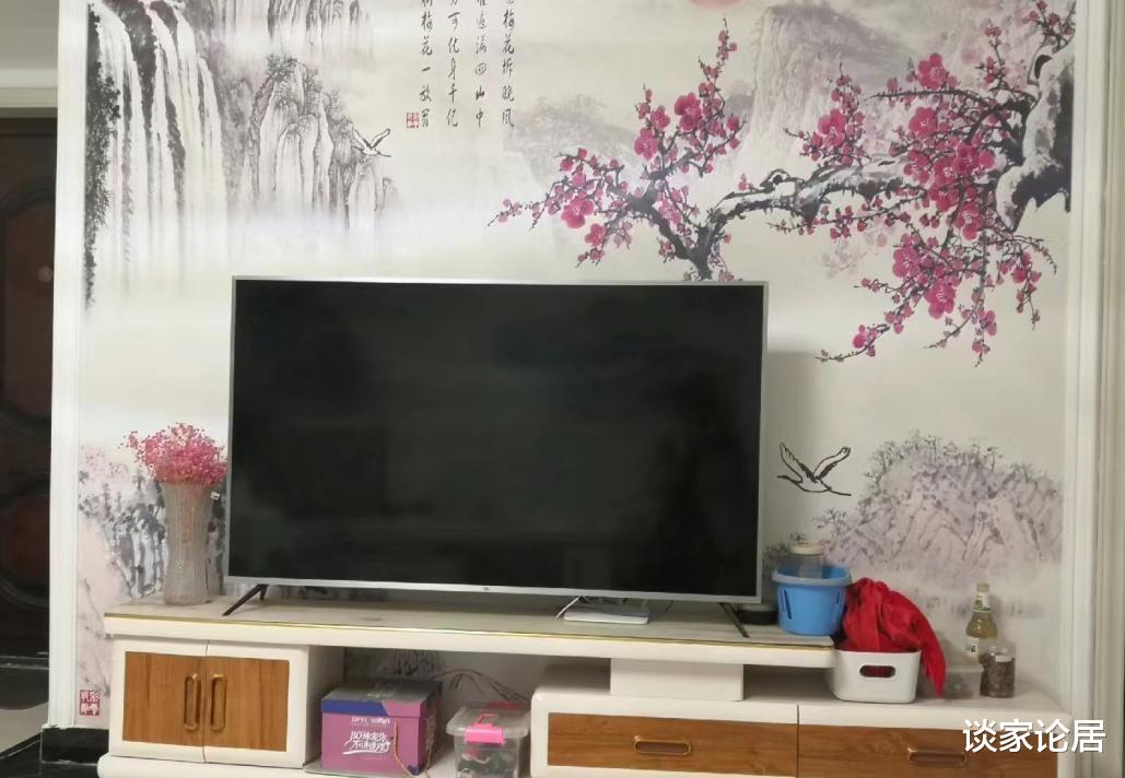 网友@风之子的背景墙是一幅红梅加远山的喜庆图案,同时还有一首诗,可是放上电视机后,已经挡了一部分,每天都每次看到都恨得牙痒痒,真想把它换掉。