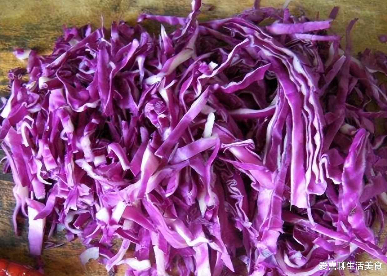 操作步骤:1,紫甘蓝摘洗干净后,切成条状,放入盘中备用。彩椒也洗净后切丝备用。