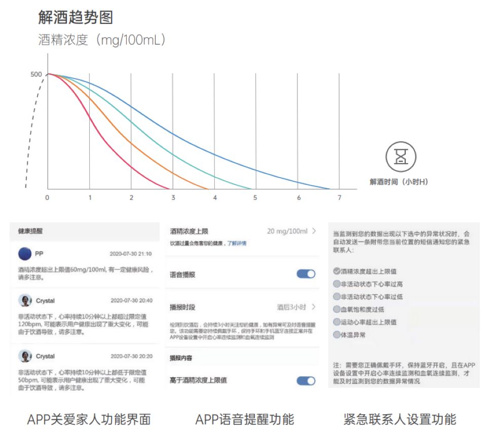 用户饮酒后,手表有解酒力评测功能。用户只需要根据APP端操作提示,按提示填写饮酒类型、品牌、酒精度数、饮酒量等信息后多次进行酒精检测后,即可评估出用户的解酒力水平。