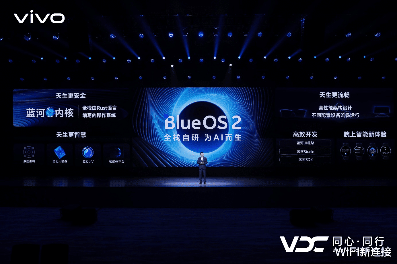 继去年11月vivo首次发布自研蓝河操作系统(BlueOS)之后,今年的开发者大会上,能力全新升级的蓝河操作系统2同步亮相,其搭载着基于Rust语言编写的实时操作系统内核——蓝河内核,其具备安全、通用、高性能的特性,能够兼容不同的嵌入式平台,具备完整的系统调度、内存管理、文件系统、网络和设备管理能力。而蓝河操作系统2也将成为行业首个全栈由Rust语言编写的操作系统。