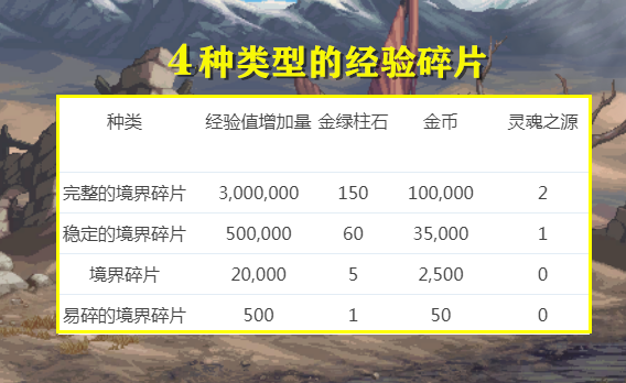 改版后,游戏存在4种“境界碎片”材料,经验值不同,喂养时所需要的材料,也是存在差异的。