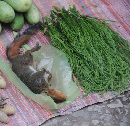 松鼠,很多人或许都没见过松鼠,在这里却是老挝人的食材之一,他们觉得松鼠肉含有丰富的蛋白质、脂肪、碳水化合物等多种成份,最重要是肉质细嫩,当地人特别喜欢烤着吃。