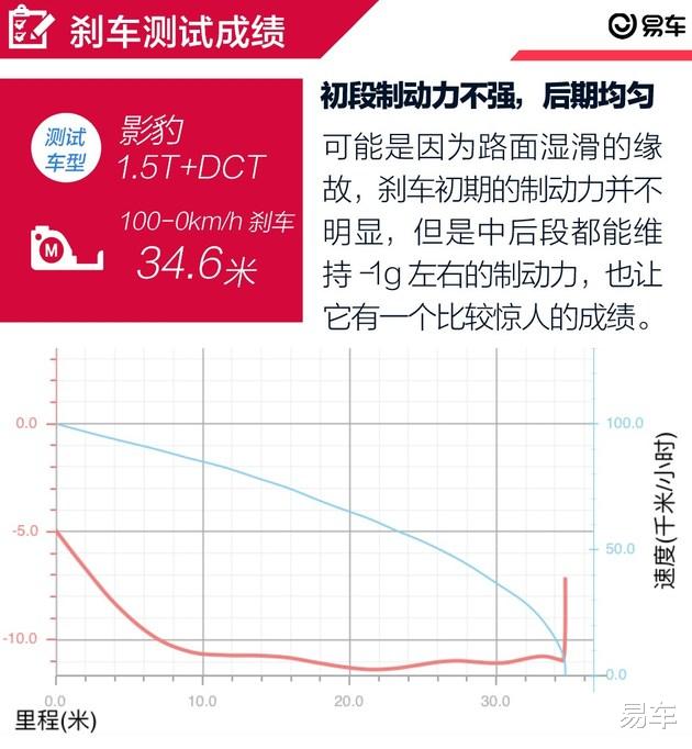 影豹的刹车成绩也相当给力,尽管测试是在湿滑路面进行,但是当我全力踩下刹车时,刹车系统反应迅速,四条运动轮胎都能提供比较好的抓地力,取得的成绩也是让我大吃一惊。