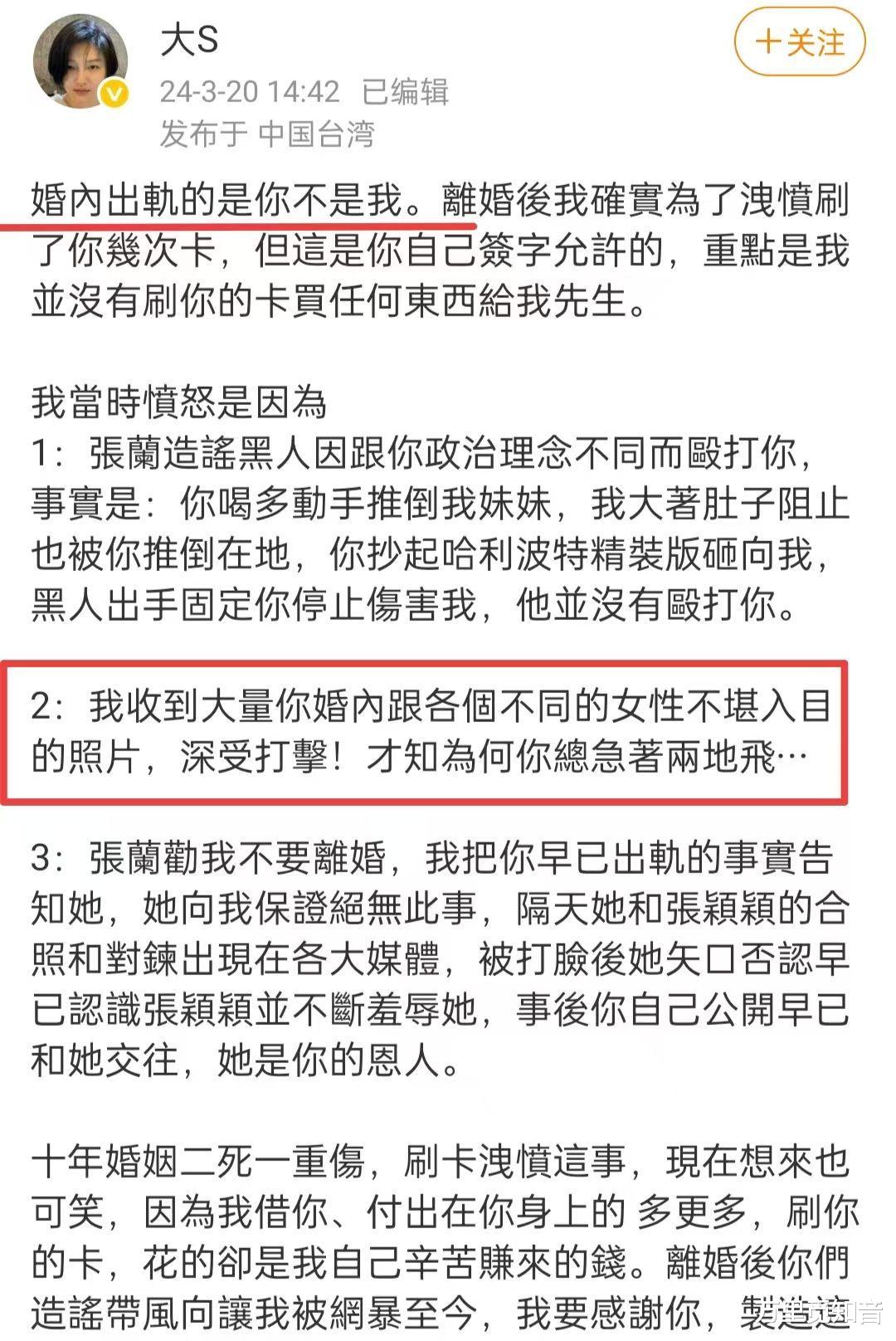 狗仔葛斯齐曾曝光的汪小菲出轨照片,以及大S后来发文控诉在婚内收到丈夫与不同女性的不堪照片,都对她造成了巨大的情感打击。