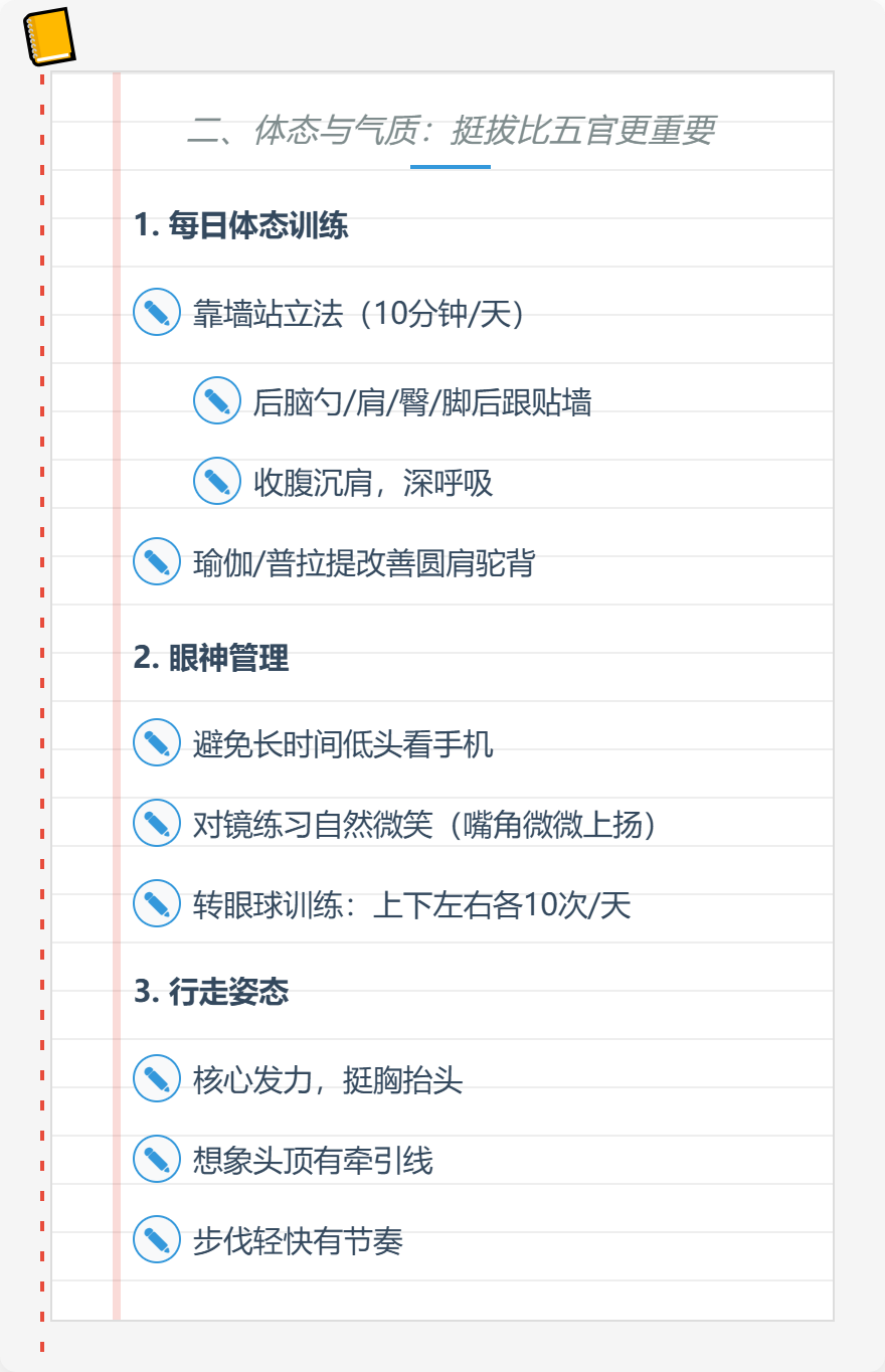 从今天开始,挑3个最容易上手的习惯(比如靠墙站10分钟+多喝两杯水+睡前涂润唇膏),先坚持21天试试看!欢迎在评论区打卡你的每日变化,或者分享你的独家变美小技巧~如果觉得这篇干货有用,记得点个赞❤️让更多朋友看到,毕竟变美这件事,当然要拉着闺蜜一起悄悄努力呀!关注我,下周教你【如何吃出好皮肤】,我们不见不散~