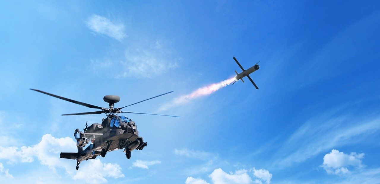 ■美国陆军的“长弓阿帕奇”武装直升机发射一枚“长钉”NLOS反坦克导弹。