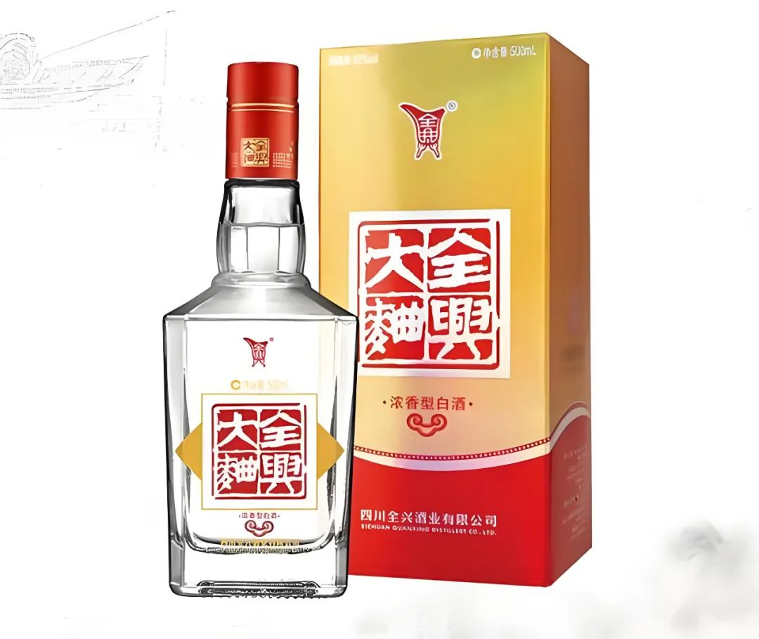 四川全兴酒业推出的全兴大曲,属于浓香型白酒。酒精度为52度,入口柔顺,窖香浓郁,回味清甜,空杯留香持久。全兴大曲采用了传统的分层堆糟法进行发酵,酒体通过陈年老窖发酿,酯化完全,香气丰富。
