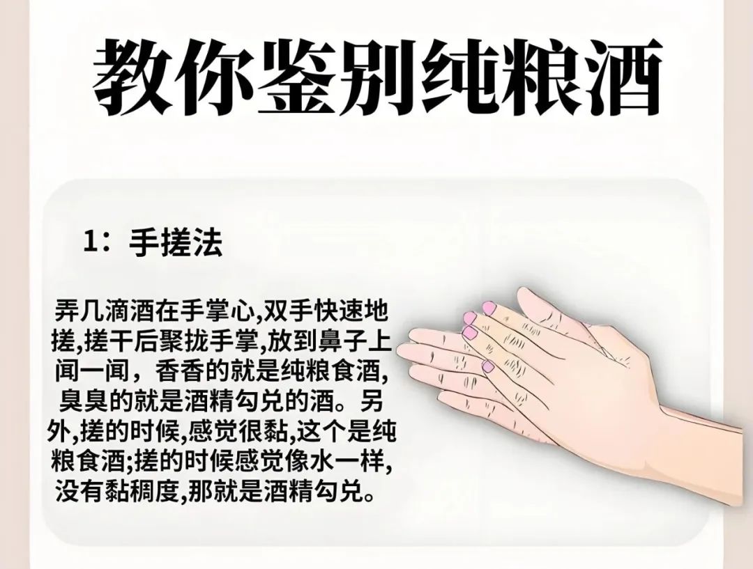 手搓测试: 倒一些酒于掌心,手心轻揉至发热,酒精挥发后,若是纯粮酒,会留下一丝余香,通常带有发酵的糟香味。