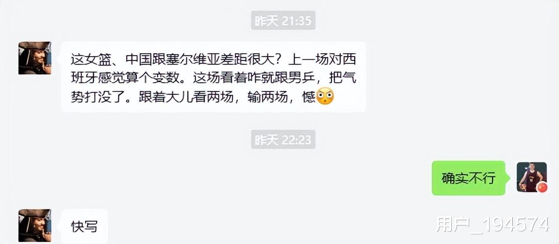 然后便催促我“快写”。问题是他没给我说让我写什么,也没说他想看什么,就只是让我快写。自然,除了他那个从小被我们看着长大的大儿子和体彩出的篮球盘口之外,对于像他这种几乎完全与篮球无甚关联的家伙,我要真的和他说起来,要真的就着他所问的中国女篮的比赛怎么打成这个样子来给他又讲解、又分析的话,我累,他也累,结果也只能是一人弹琴一人听。