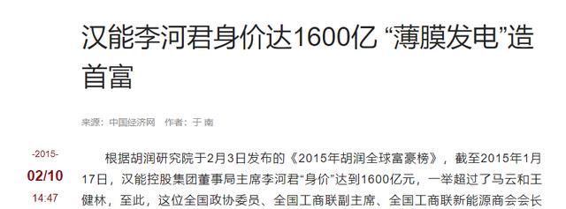 汉能李河君身价达1600亿 “薄膜发电”造首富=来源:中国经济网 作者:于 南-2015-02/1014:47