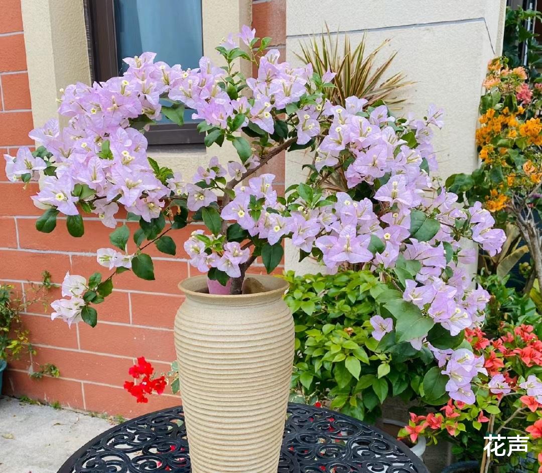 三角梅只在两广、福建、云南等少数地方可以全年露养,其他地方多为盆栽观赏,丽娜这个品种就很适合盆栽,对花盆要求不严,口径15厘米以上的花盆就可以养一棵,盆养的株高可控制在30-50厘米,且分枝多,易造型,株型紧凑圆润,更为难得的是枝条上的刺很少,不扎手,很适合家庭种植,可以摆放在阳台、窗台等地方作为观赏、装饰用。