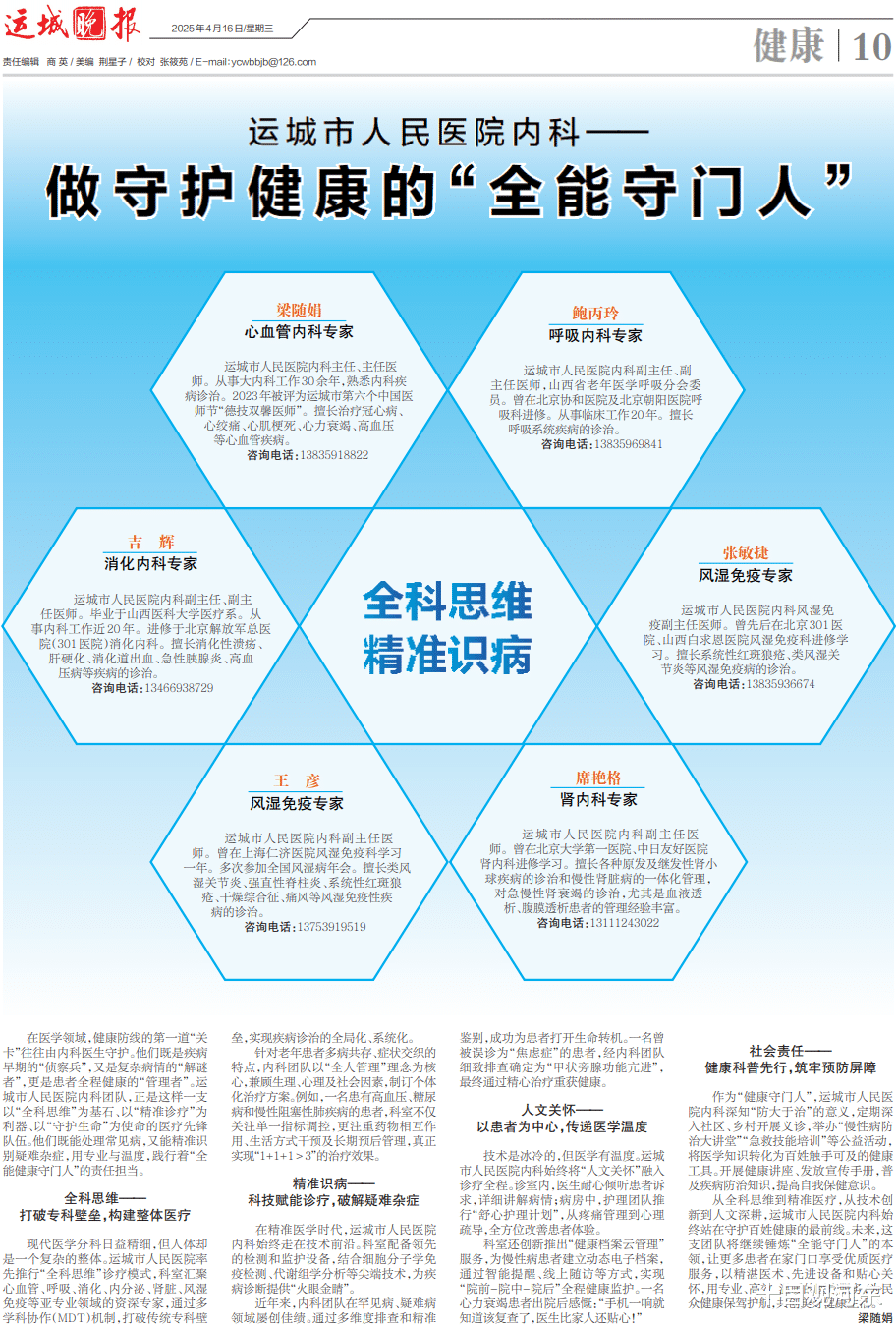在医学领域,健康防线的第一道“关卡”往往由内科医生守护。他们既是疾病早期的“侦察兵”,又是复杂病情的“解谜者”,更是患者全程健康的“管理者”。运城市人民医院内科团队,正是这样一支以“全科思维”为基石、以“精准诊疗”为利器、以“守护生命”为使命的医疗先锋队伍。他们既能处理常见病,又能精准识别疑难杂症,用专业与温度,践行着“全能健康守门人”的责任担当。