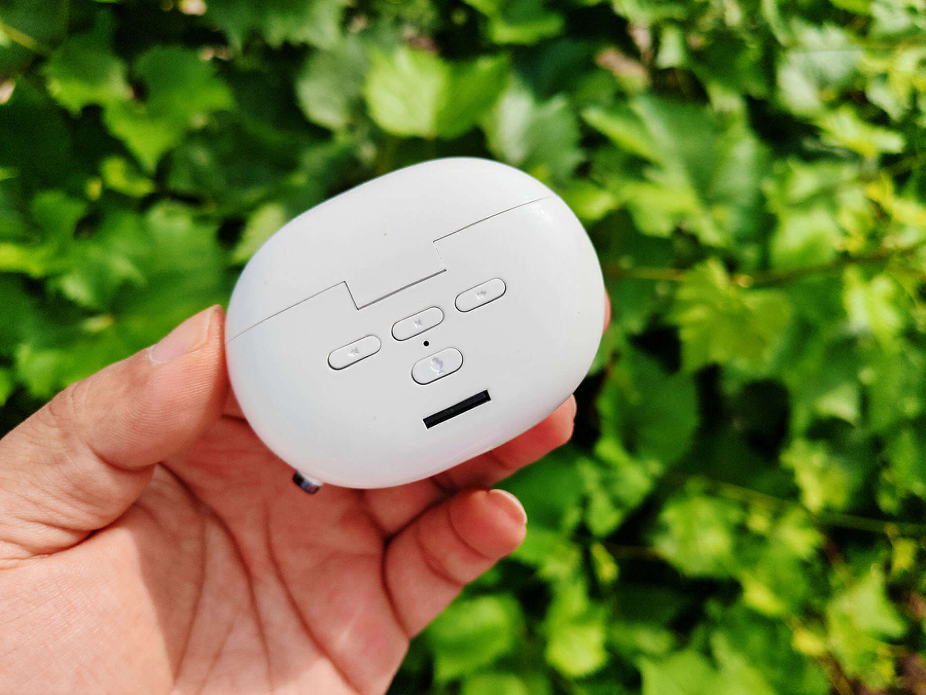 这款耳机的与目前见过的大多数耳机不同的地方在于其耳机仓背后的设计,耳机仓背后拥有四个实体按键,同时还有个内存卡卡槽,除了耳机的电量灯外,后面还有一个功能切换指示灯。
