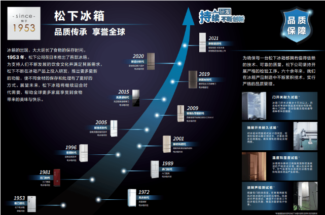松下作为一家拥有超过100年历史的日系品牌,自从1953年研发出第一台冰箱,距今已整整70年。在这70年间,松下冰箱不断进行技术迭代,从最开始的单门冰箱,逐渐研发出风冷、三门、变频冰箱等等,再到如今的新智能、超薄、全嵌的冰箱,其实力大家有目共睹。