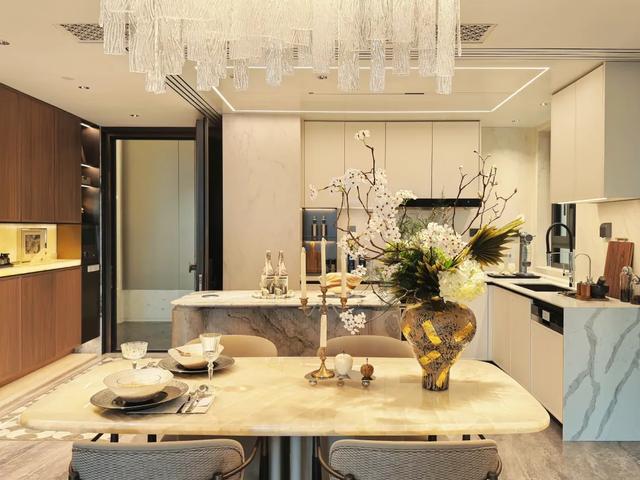 建面约134㎡的大户型,厨房也是可完全打开与客厅融合为一体,用奢石打造的西厨岛台,高品质让人一眼心动。