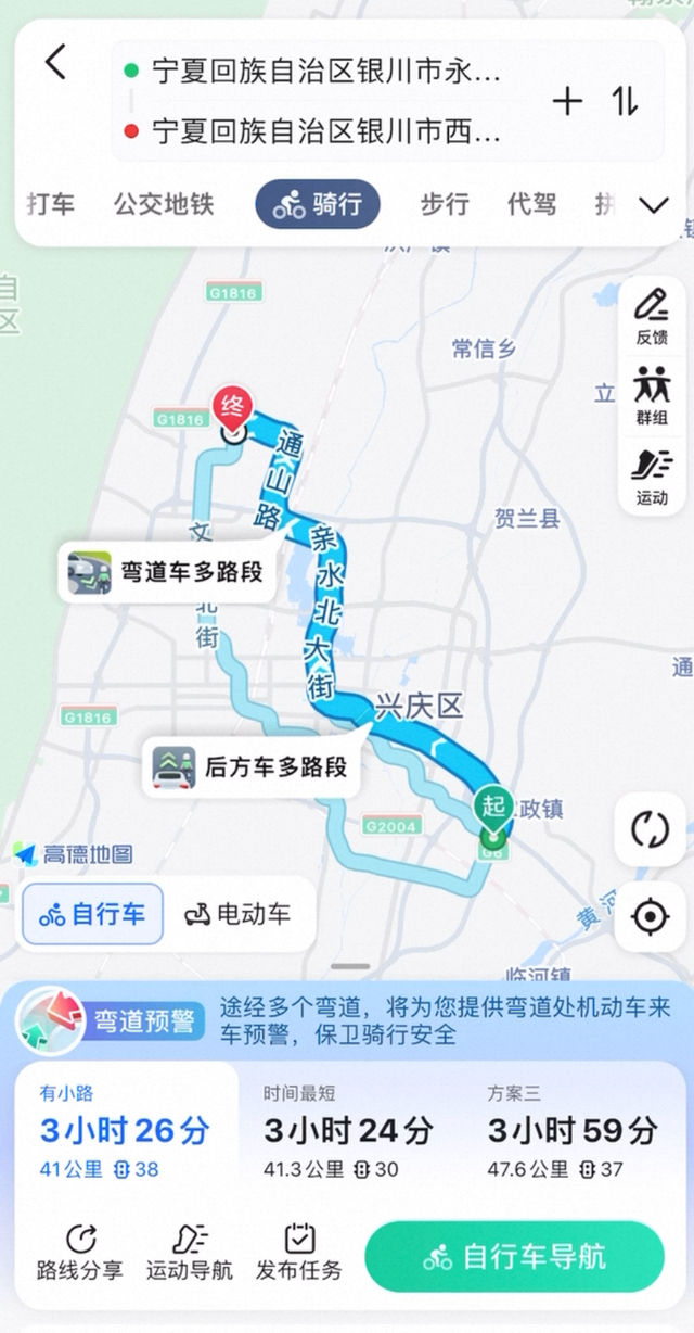 除了提供实时的盲区预警,在日常出发前的路线规划阶段,高德骑行安全预警系统也会标识出后方来车超车和弯道会车高发的路段,让骑行用户在出行前就能了解潜在的风险高发点,预先做好应对准备。
