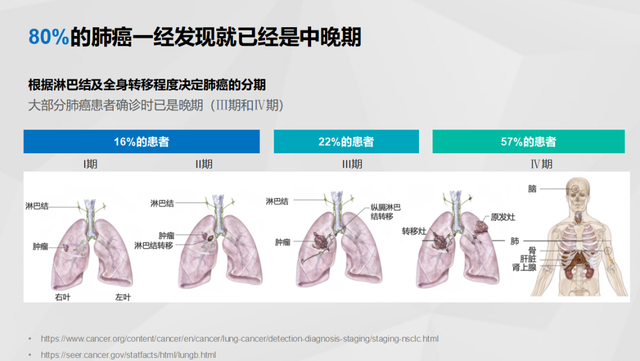 肺癌的发病非常隐匿,80%以上的肺癌一经发现就是中晚期,大部分患者确诊的时候,就已经合并有淋巴结转移甚至是远处转移,而且很多病人即便是晚期了,依然是没有任何症状的。