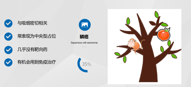 鳞癌,是跟吸烟是密切相关的,而且通常都是中央型的病灶,因为长年吸烟的人,气道是被烟草损伤的比较频繁的区域,所以鳞癌呢,不像腺癌一样起源于周围肺泡,它更容易长在气管和支气管里面。就像这张图一样,腺癌都是桃子,长在树枝上,而鳞癌是猴子,蹲在树干上。桃子是可以吃的,所以腺癌是有机会吃靶向药的,而鳞癌几乎没有靶向药。但是时下最热门的免疫治疗,对大部分鳞癌,都有效。