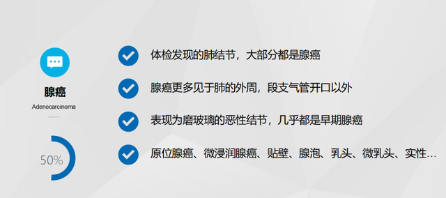 在非小细胞肺癌里面,外科最常见的是腺癌,其次是鳞癌。那么腺癌通常是周围型的,我们外科手术切下来的肺结节,大部分都是腺癌,尤其是表现为磨玻璃结节的肺癌,几乎都是早期腺癌。那么浸润性的肺腺癌,又分为很多个亚型。像原位癌、微浸润、贴壁、腺泡、微乳头等等,这些概念我们后续的课程还会详细去讲。