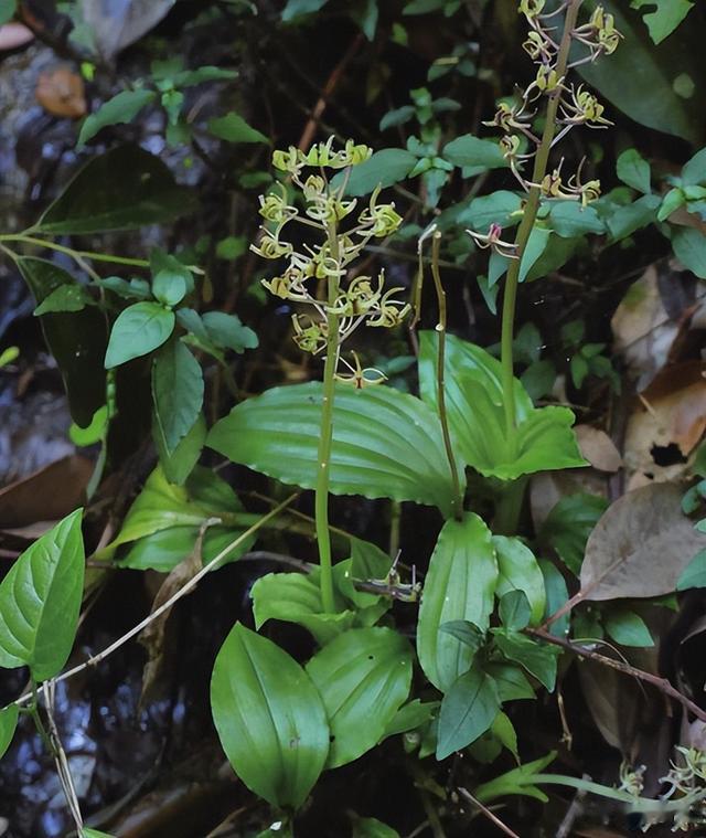 地生植物。茎直立,圆柱形,下部具3~6枚叶。叶片卵形、椭圆形或卵状披针形,有时稍歪斜。总状花序顶生,具多数密生的花,花小,红褐色或褐绿色。花期4-5月。