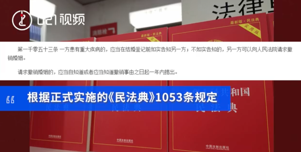 截图来源:@021视频 本案中被告在结婚登记之前未如实告知原告其患艾滋病的事实,原告在知情后一年内向法院起诉要求撤销婚姻, 应予以支持, 故依法判决撤销原被告的婚姻关系。 据悉,《民法典》实施之后,不仅将登记结婚前隐瞒重大病情作为无过错方可以撤销婚姻的情形之一, 而且还赋予无过错方主张损害赔偿的权利, 原告因此得到了最有效的维权途径。 来源▏中国青年报(ID:zqbcyol 整理:陈垠杉)综合:闵行法院、@021视频 等 ▼ 扬子晚报 微信矩阵 ▼