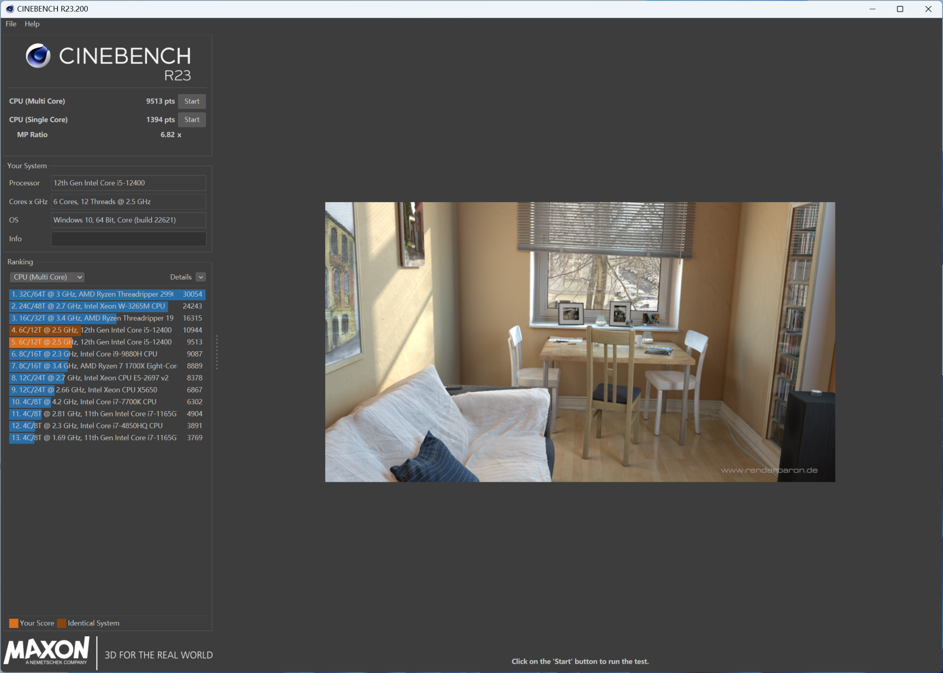 通过Cinebench R23测试,其单核得分9513pts,多核得分1394pts,对比上代i5性能提升了非常多,可以说最近两代(12、13代)的intel还真是把牙膏挤爆了,以至于i5已经成了主流,甚至是旗舰配置的首选。