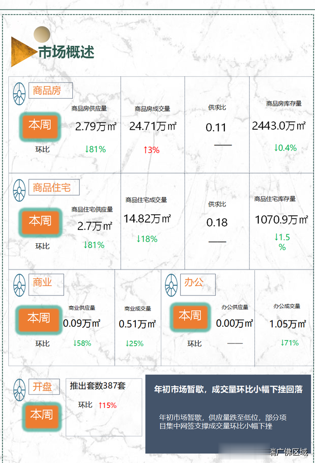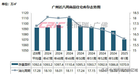 截止至第1周,全市商品住宅存量面积下降至1070.9万㎡,去化周期缩短至16.08个月。