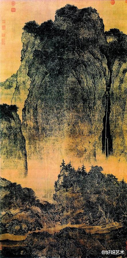 当目光初次触及这幅画时,那三座山峰便以一种雄伟而又不失秀丽的姿态闯入视野。山峰高耸入云,岩石的轮廓被画家以刚劲有力的笔触勾勒,线条清晰而流畅,仿佛是大自然用它那无形的巨手在天地间镌刻出的杰作。山峰的岩石纹理细致入微,每一处褶皱都像是在诉说着岁月的沧桑变迁。那岩石的色泽,从深沉的墨色到浅淡的灰色过渡自然,恰似晨曦或暮霭中,山峰在光影下的真实写照,给人一种厚重而坚实的感觉,仿佛它们是大地的脊梁,承载着世间万物的生机与希望。