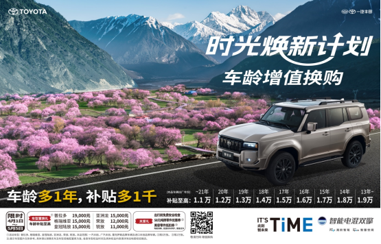 在“时光焕新计划”中,一汽丰田针对普拉多、皇冠陆放、格瑞维亚、亚洲龙、荣放、锐放等核心车型设置了梯度补贴政策。其中,置换皇冠陆放叠加国补最高可享30000元综合补贴,亚洲龙叠加国补置换补贴最高达30000元,其他车型综合补贴力度从15000元至27000元不等。值得一提的是,该计划首创了“车龄增值补贴”机制,即基础补贴随车龄每年递增1000元,叠加国家补贴形成双重保障。这一机制不仅让用户能够享受到实实在在的优惠,更让他们感受到了时间的价值——车龄越长,补贴越高,真正实现了“一车传三代,置换趁现在”。