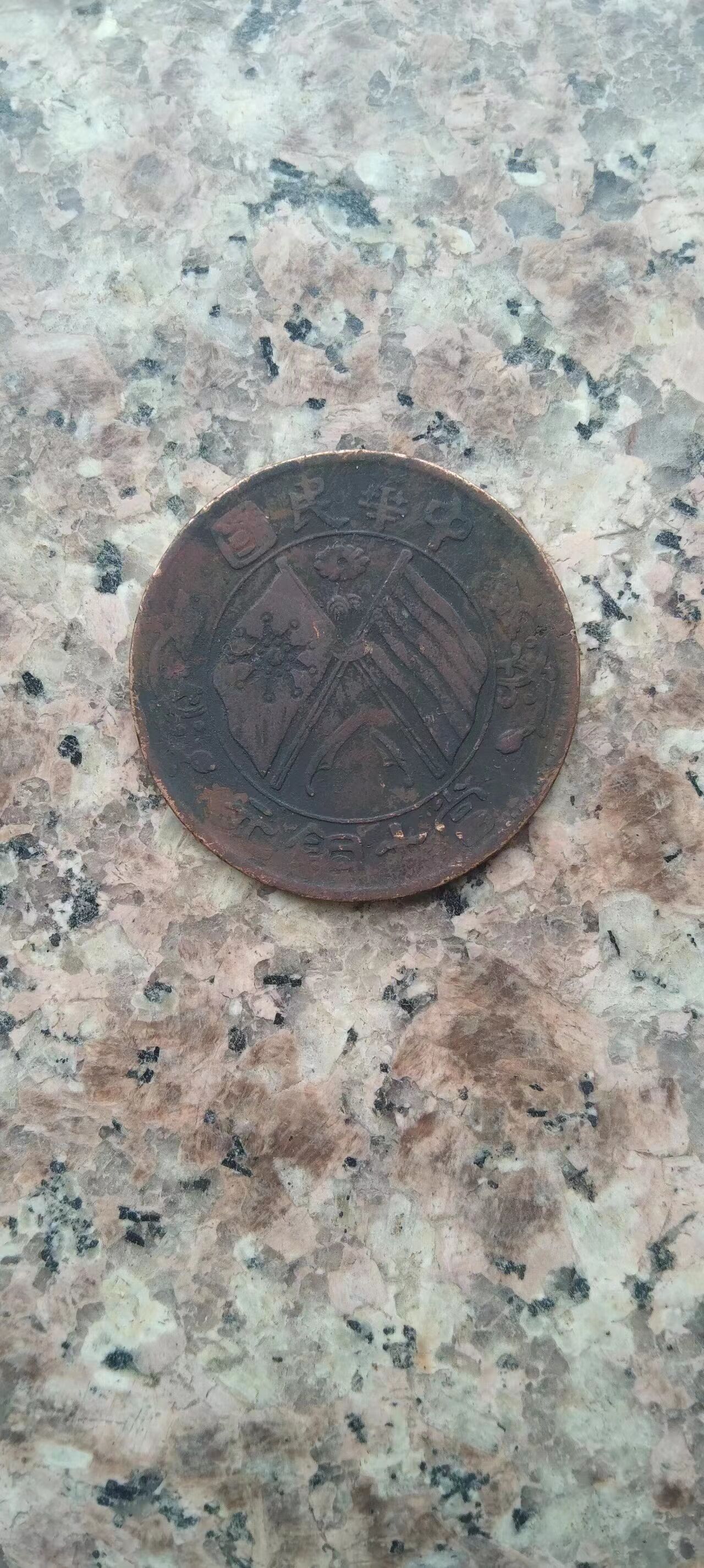 双旗币极其稀缺,大家都知道民国多年抗战,战争中需要大量的子弹,而制作子弹最好的材料就是民国时期的铜币,从而导致大量民国铜币被毁制作成弹壳,使目前的双旗币极为稀少。此枚中华民国当十铜元双旗币,品相完好,纹饰清晰,铜光闪闪,熠熠生辉,非常耀眼,钱币正面珠圈内左为十八星旗、右为五色旗,两面国旗相互交叉,上系结带,珠圈外上环为"中华民国"四字,下环铸"当十铜元",钱币背面珠圈内图案为葡萄藤纹饰,