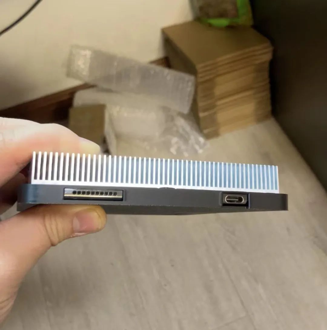 什么叫“被动式散热”?那就是内部没有风扇,全靠散热片进行热量传导,优点是没噪音,内部不易积灰。这个盒子用了三星Fold3主板改造,外部就是一大块铝片,长宽大概是16x12cm,跟三星Fold3折叠屏展开后差不多。