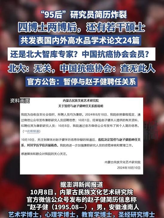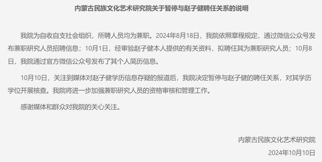 **内蒙古民族文化艺术研究院,**这家曾经向赵子健抛出橄榄枝的单位,也在第一时间与其撇清了关系。在发布的解聘公告中,研究院表示将对赵子健的学历学位展开核查。