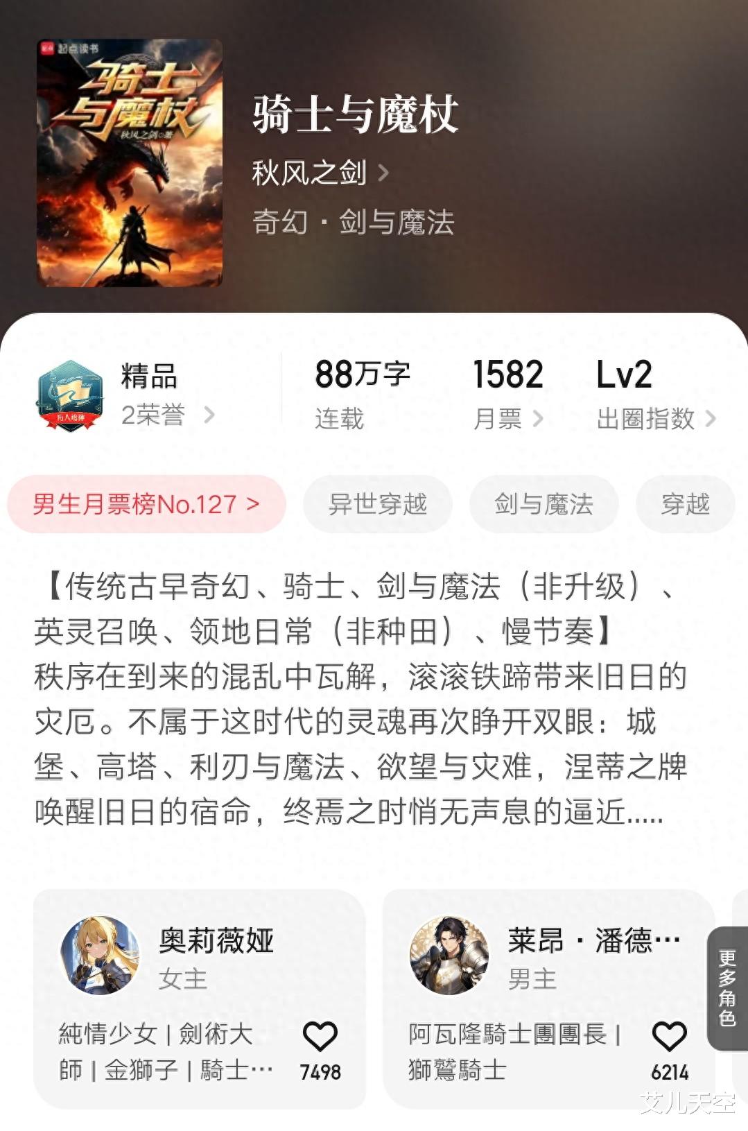 秋风之剑的《骑士与魔杖》在今天破了万订,一本比较传统向的奇幻文。