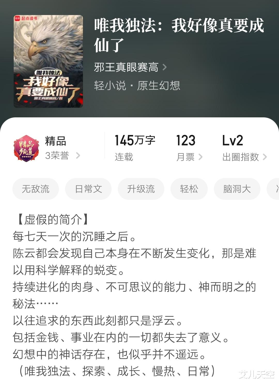 另一本是邪王真眼赛高的《唯我独法:我好像要成仙了》,完结的有些突然,疑似审核方面的问题。