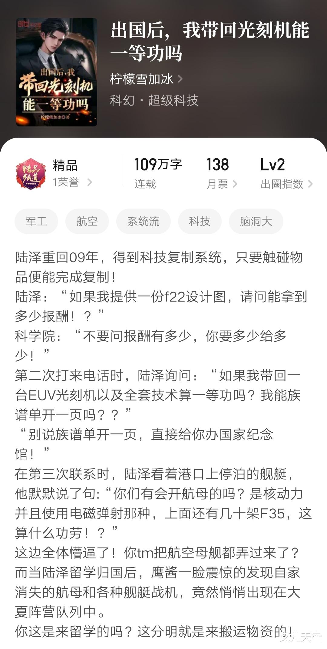一本是柠檬雪加冰的《出国后,我带回光刻机能一等功吗》,创世首发的黑科技文,起点这边拿到了八千均的成绩,最高时到过九千的。
