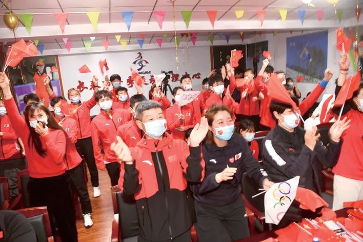 5日18时许,在长春市冬季运动管理中心运动员公寓,长春市部分教练员、运动员等汇聚一堂,他们挥舞着国旗,一起为中国短道速滑队加油。