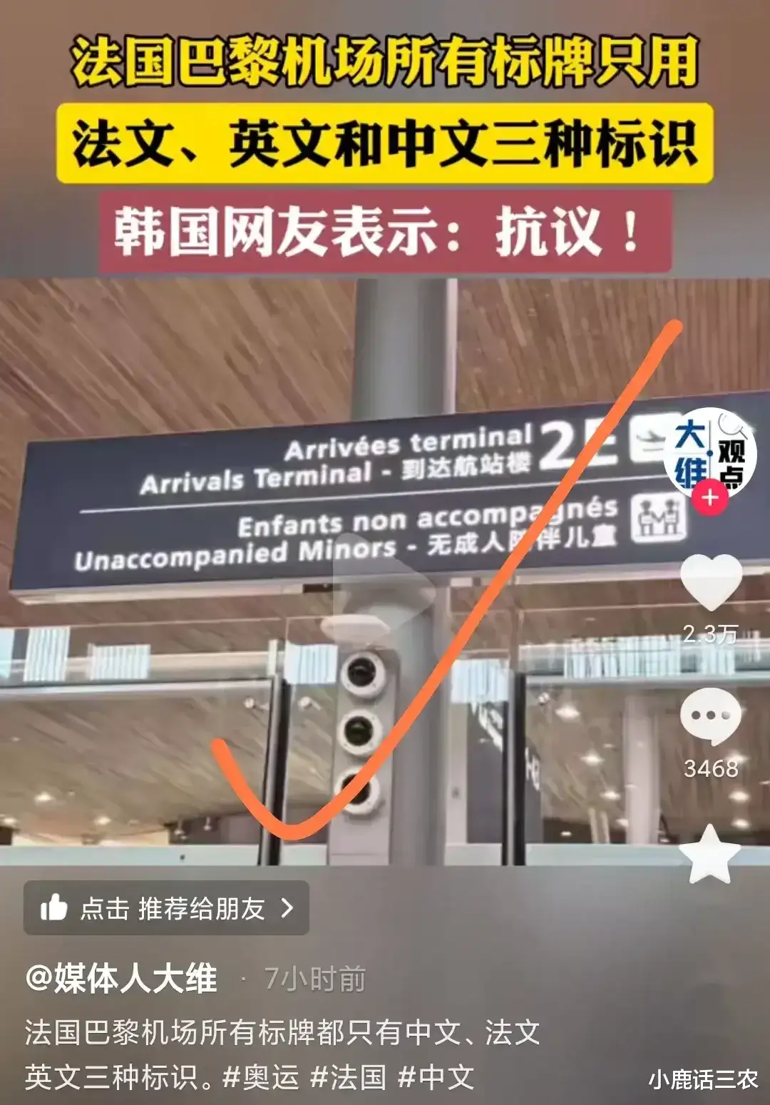 最近,一条关于法国巴黎奥运会前巴黎机场标牌只有中文、法文和英文而没有韩文的消息在韩国网络上引起了热议。一些韩国网友在巴黎戴高乐机场看到了只有中文、法文和英文的标牌,没有韩文,因此感到非常不满,纷纷在社交媒体上表达自己的意见,认为韩国被忽视了。