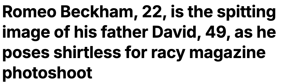 据英媒2月22日报道,罗密欧在这组照片中上身没穿衣服,躺在床上的他露出了身上的纹身,他那极具个性的发型,也和大卫在足球鼎盛时期的造型如出一辙,看来在时尚这一块,他深得父亲的真传。