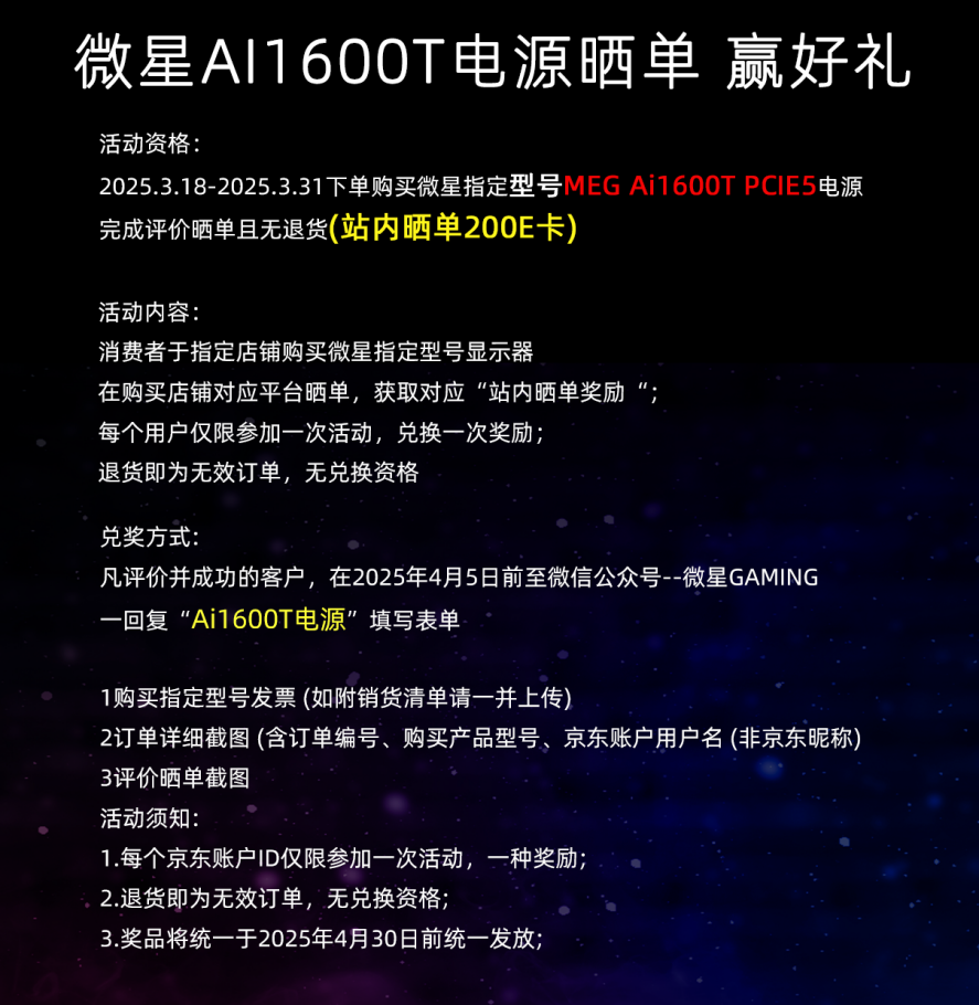 MEG Ai1600T PCIE5超神3月18日起至31日首发期间,晒单即返200元E卡,到手价仅3999元。