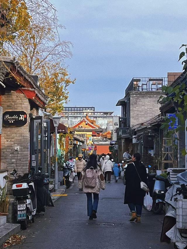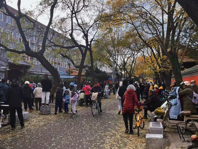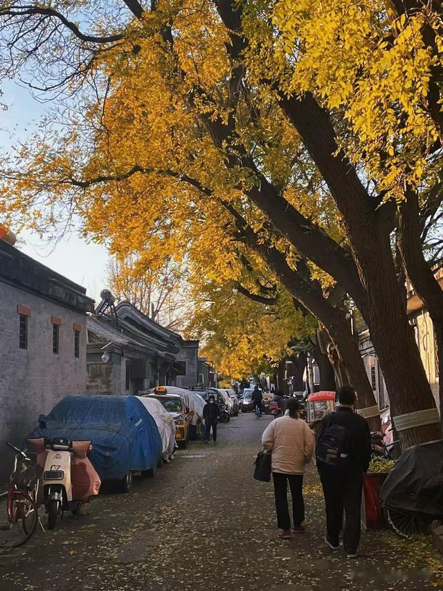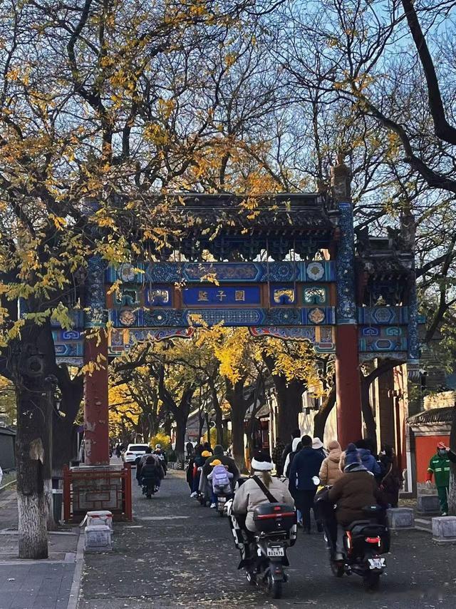 成贤街,现名国子监街,是一条东西向的胡同,北京城内现存不多的古老街道之一,巍然耸立的牌坊后面是夹道的老槐树,满地金黄的落叶,简直不要太美。