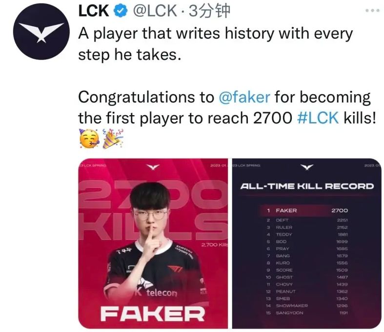 在T1与KT的这场通信社大战结束之后,Faker选手最终的击杀数也来到了2700,同时也是第一位达到此击杀的选手,对此,LCK官方也第一时间的发文祝贺了Faker选手达到了2700击杀:“一位每走一步都在书写全新历史的选手。祝贺Faker成为第一位获得LCK2700击杀的选手。”